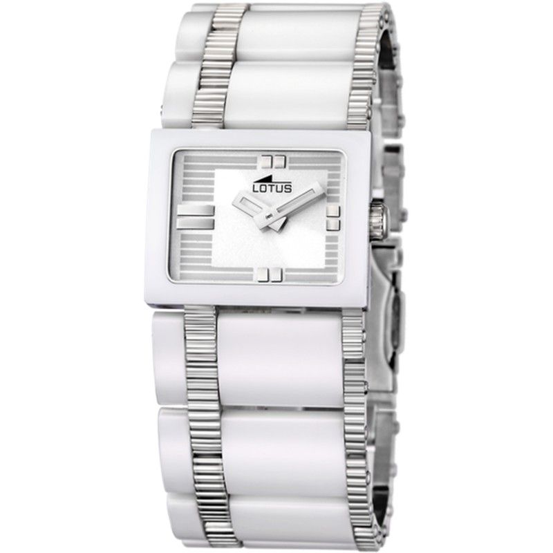 Lotus dameur 15597/1 stål. 22 mm rektangulær stålkasse. Stål armbånd. Foldespænde. Hvid skive. Mineralsk krystal. Quartz værk. Nedsænkelig 30m. 3 års garanti. Ref 15597/1