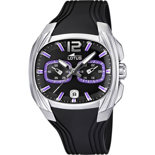 Lotus Herreur 15756/3 Sport Sort. 37,5 mm stålkasse. Sort silikone rem. Spænde lukning. Sort urskive lilla detaljer. Multifunktion, kronograf, kalender. Mineralsk krystal. Quartz værk. Nedsænkelig 50m. 3 års garanti. Ref 15756/3
