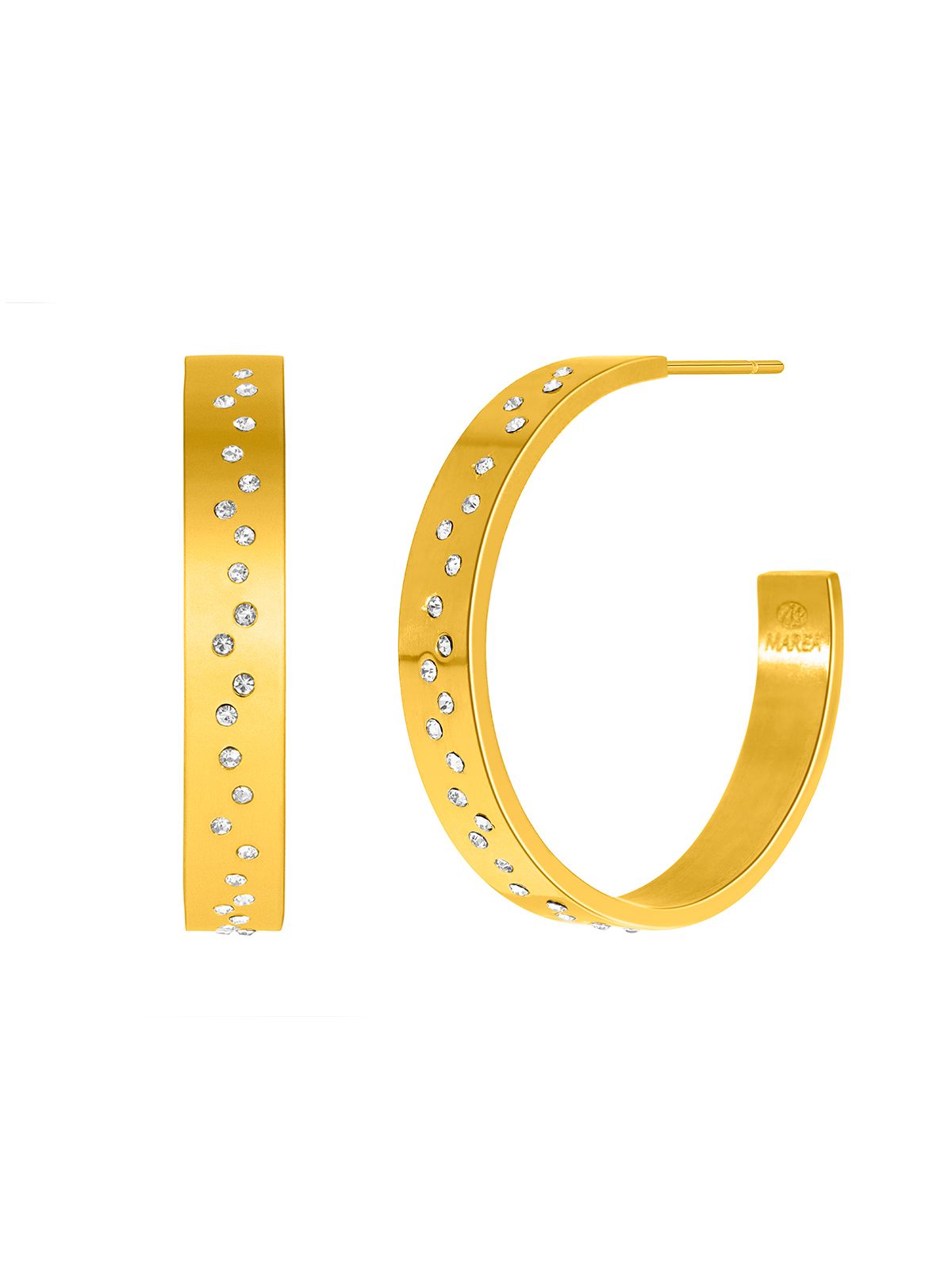 Pendientes Marea Acero Dorado C03101/AH Medio Aro Abierto Circonitas. Pendientes fabricados en acero dorado inoxidable. Diseño de medio aro abierto con circonitas. Cierre presión. Certificado de autenticidad y garantía de calidad en los materiales de fabricación. Ref C03101/AH