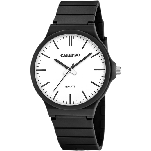 Reloj Calypso Hombre K5879/3 Sport Negro Analógico. Caja de plástico negro de 42,1mm de diámetro. Bisel negro. Correa de silicón negro. Cierre hebilla. Esfera blanca. Cristal mineral. Movimiento quartz. Sumergible 50m. 3 años de garantía. Ref K5879/3