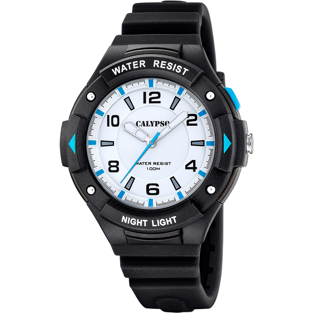 Reloj Calypso Hombre K5883/1 Sport Negro Analógico. Caja de plástico negro de 48,4mm de diámetro. Bisel negro. Correa de silicón negro. Cierre hebilla. Esfera blanca. Cristal mineral. Movimiento quartz. Sumergible 100m. 3 años de garantía. Ref K5883/1