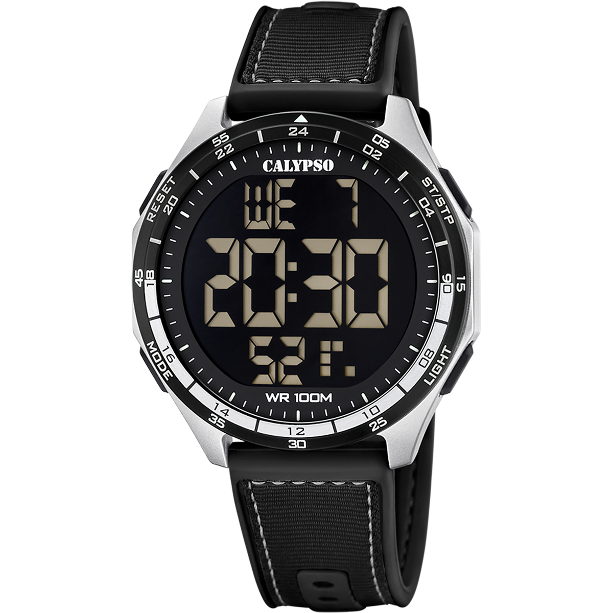 Reloj Calypso Hombre K5887/4 Sport Negro Digital. Caja de plástico de 46,9mm de diámetro. Bisel negro. Correa de silicón negro. Cierre hebilla. Esfera negra. Multifunción, funciones digitales. Cristal mineral. Movimiento quartz. Sumergible 100m. 3 años de garantía. Ref K5887/4