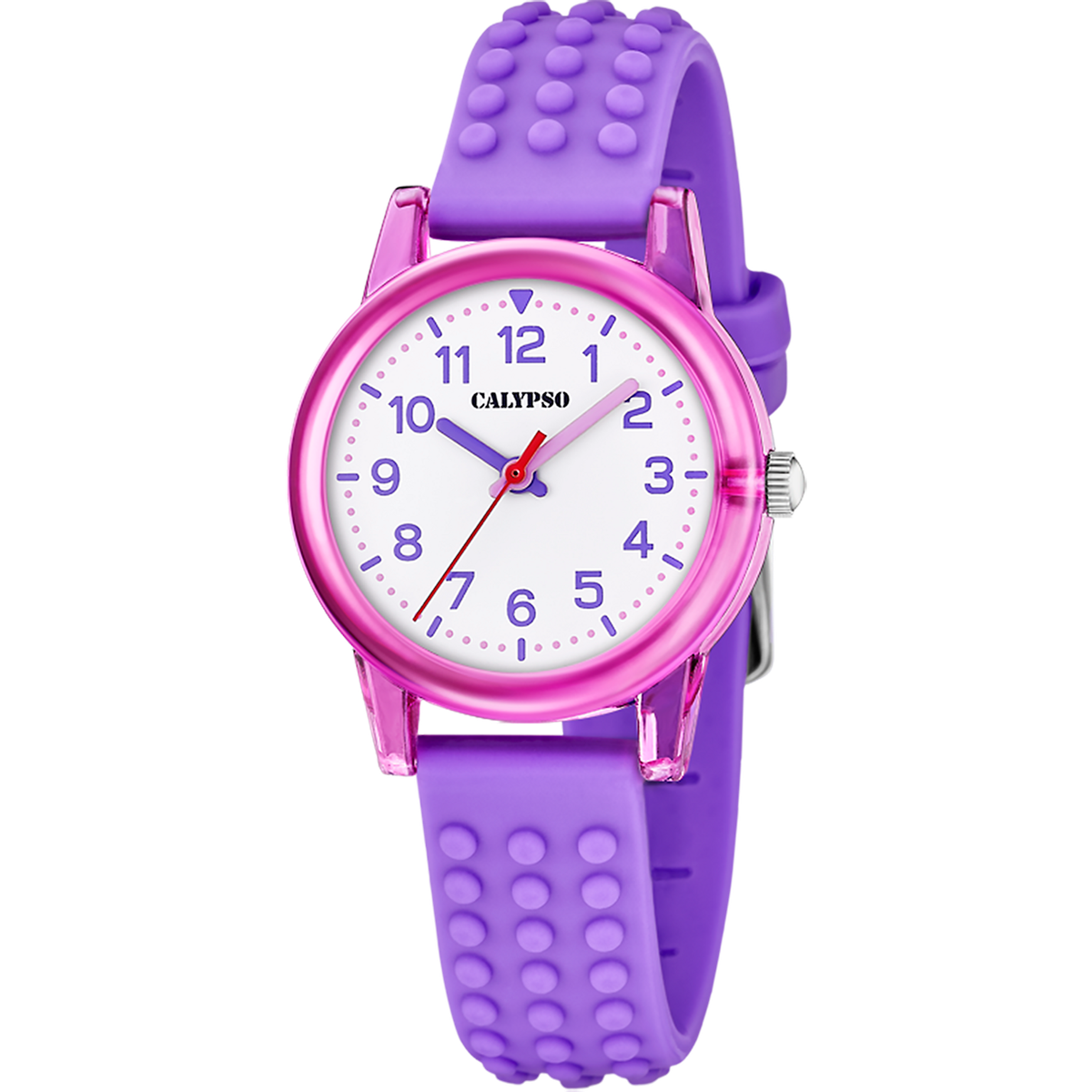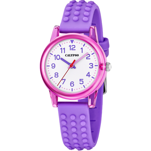 Reloj Calypso Infantil K5876/3 Sport Morado Analógico. Caja de plástico morado de 30,2mm de diámetro. Bisel morado. Correa de silicón morado. Cierre hebilla. Esfera blanca. Cristal mineral. Movimiento quartz. Sumergible 50m. 3 años de garantía. Ref K5876/3