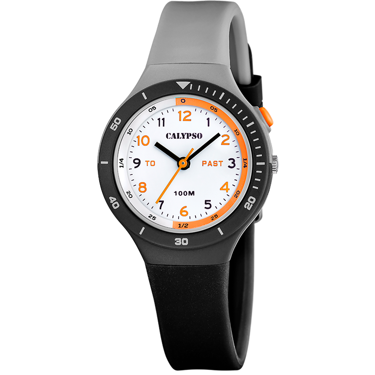 Reloj Calypso Infantil K5882/4 Sport Negro Bicolor Gris Analógico. Caja de plástico negro bicolor gris de 38,1mm de diámetro. Bisel negro. Correa de silicón negro bicolor gris. Cierre hebilla. Esfera blanca. Cristal mineral. Movimiento quartz. Sumergible 100m. 3 años de garantía. Ref K5882/4