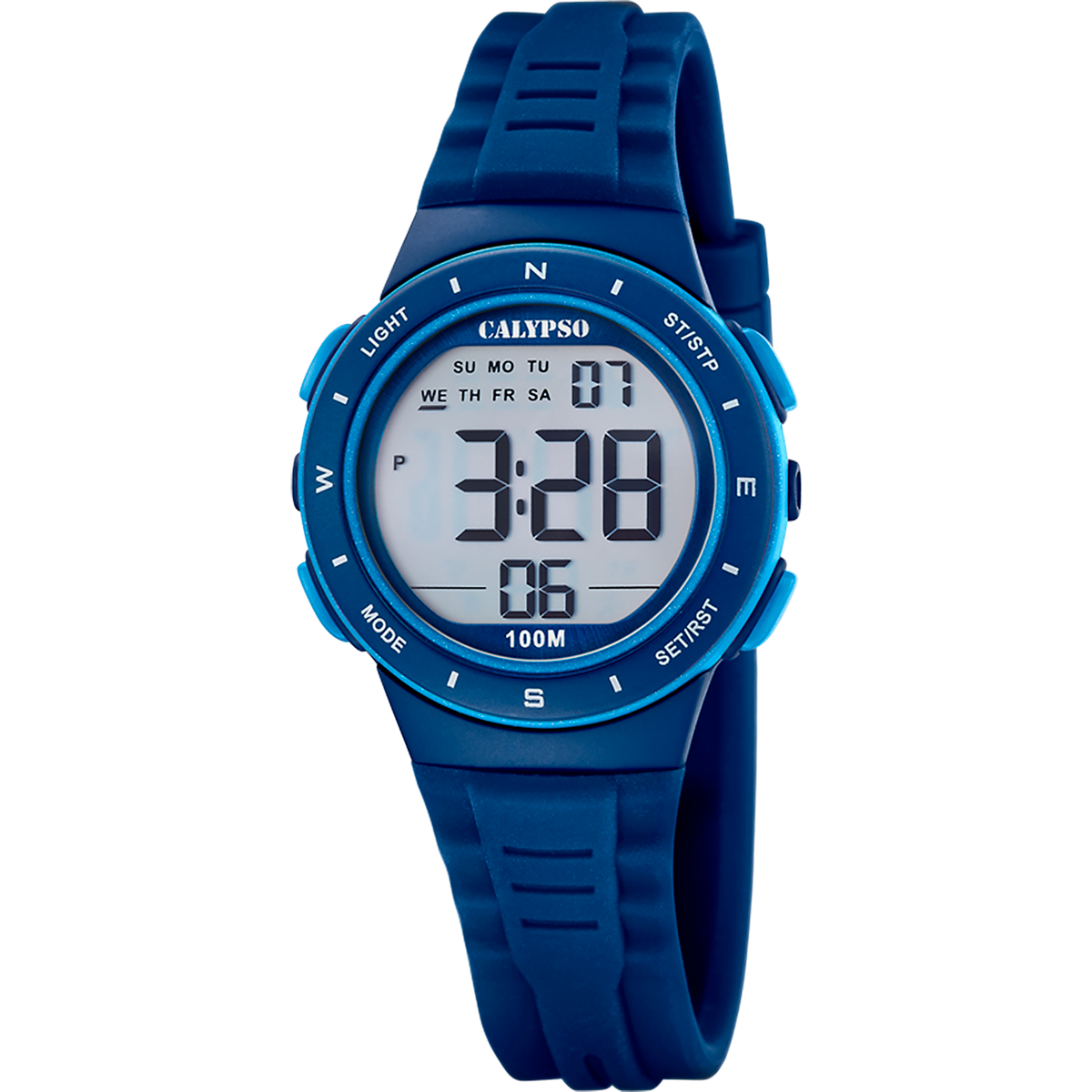 Reloj Calypso Infantil K5885/3 Sport Azul Digital. Caja de plástico azul de 37,5mm de diámetro. Bisel azul. Correa de silicón azul. Cierre hebilla. Esfera azul. Multifunción, calendario, funciones digitales. Cristal mineral. Movimiento quartz. Sumergible 100m. 3 años de garantía. Ref K5885/3