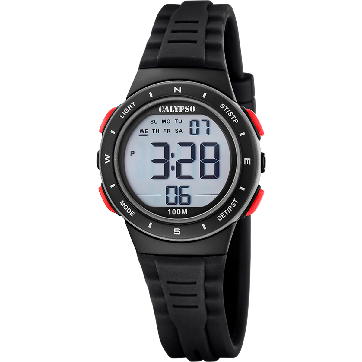 Reloj Calypso Infantil K5885/4 Sport Negro Digital. Caja de plástico negro de 37,5mm de diámetro. Bisel negro. Correa de silicón negro. Cierre hebilla. Esfera negra. Multifunción, calendario, funciones digitales. Cristal mineral. Movimiento quartz. Sumergible 100m. 3 años de garantía. Ref K5885/4