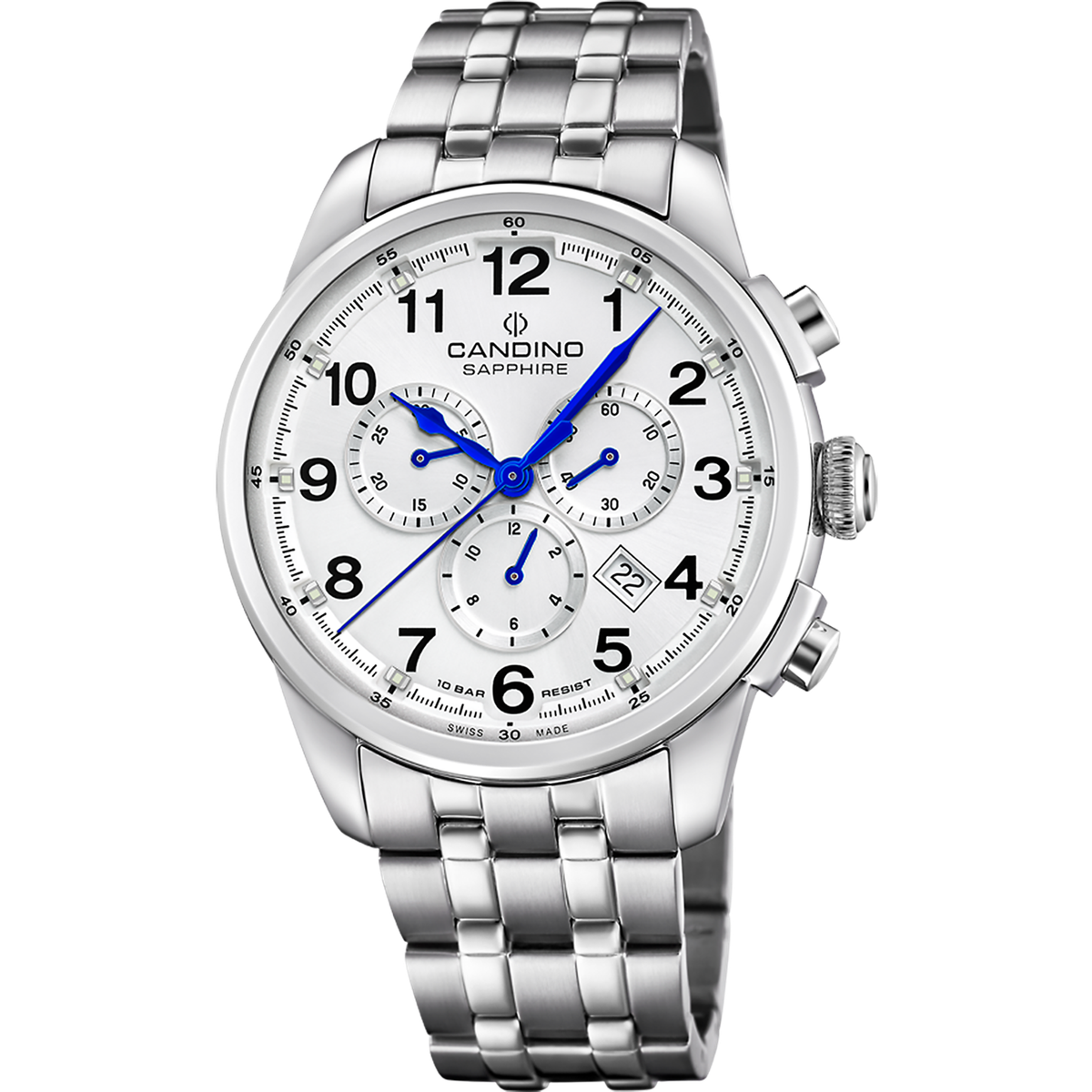 Reloj Candino Hombre C4744/1 Acero Cronógrafo Analógico. Caja de acero de 44mm de diámetro. Bisel plateado. Brazalete de acero inoxidable plateado. Cierre desplegable. Esfera plateada. Multifunción, calendario. Cristal zafiro. Movimiento quartz. Swiss Made. Sumergible 100m. Peso 169,7gr. 3 años de garantía. Ref C4744/1