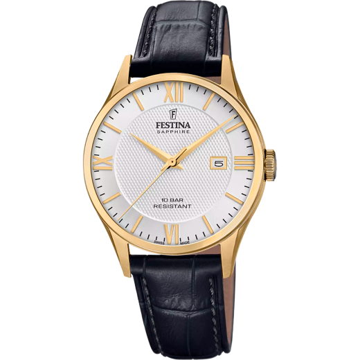 Reloj Festina Hombre F20010/2 Acero Dorado Correa Piel Negra Analógico. Caja de acero inoxidable dorada de 40mm de diámetro. Bisel dorado. Correa de piel negra. Cierre de hebilla de acero inoxidable. Esfera plateada, agujas/dial dorados. Multifunción calendario, tres agujas. Cristal zafiro. Movimiento quartz. Swiss Made. Sumergible 100m. 3 años de garantía. Peso 60g. Ref F20010/2