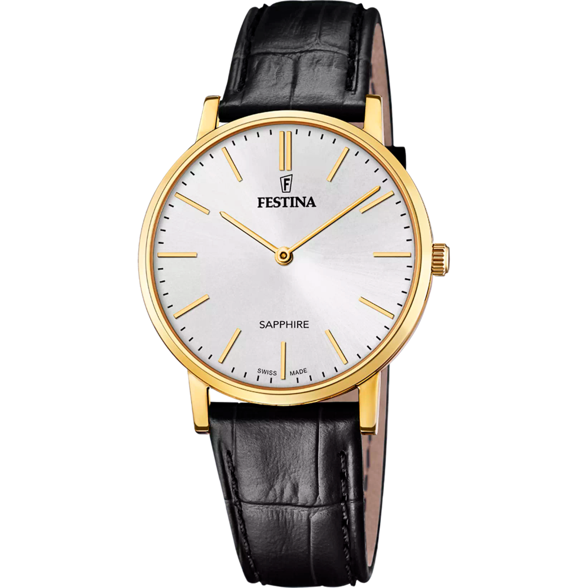 Reloj Festina Hombre F20016/1 Acero Dorado Correa Piel Negra Analógico. Caja de acero inoxidable dorada de 39,3mm de diámetro. Bisel dorado. Correa de piel negra. Cierre de hebilla de acero inoxidable. Esfera blanca. Cristal zafiro. Movimiento quartz. Swiss Made. Sumergible 50m. 3 años de garantía. Peso 38,17g. Ref F20016/1