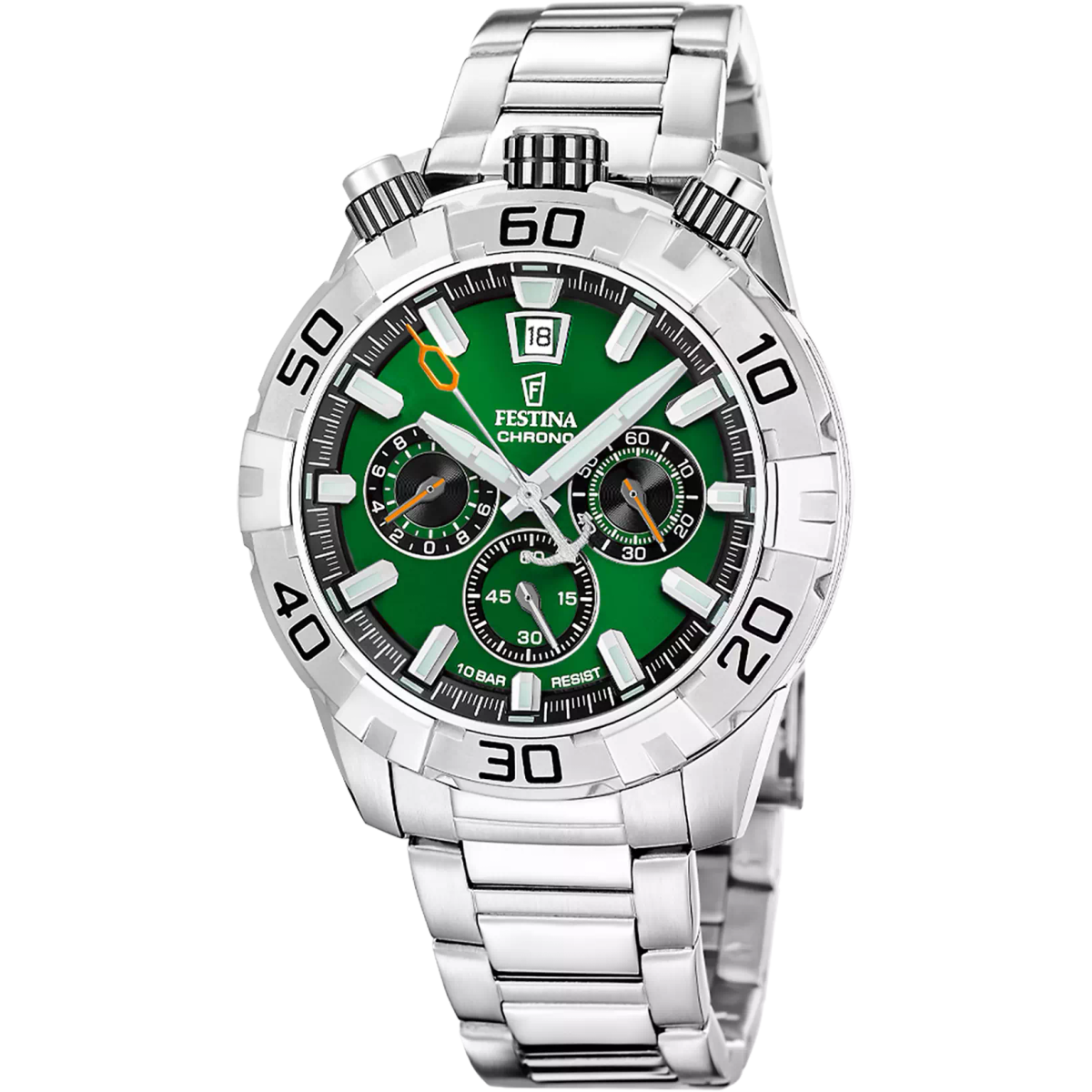 Reloj Festina Hombre F20743/2 Cronógrafo Acero Plateado. Caja de acero plateado de 45mm de diámetro. Bisel plateado. Brazalete de acero. Cierre desplegable. Esfera verde oscuro. Multifunción calendario, cronógrafo. Cristal mineral. Movimiento quartz. Sumergible 100m. Peso 182,72g. 3 ańos de garantía. Ref F20743/2