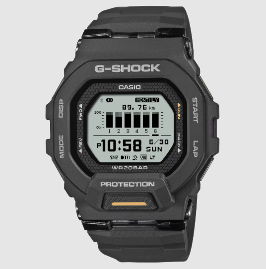 Reloj G-Shock Hombre GBD-200-1A1 Sport Negro Digital. Caja de resina negra de 48,4x45,9mm de diámetro. Bisel negro. Correa de resina negra. Cierre hebilla. Esfera negra. Resistencia a golpes. Multifunción, múltiples funciones de entrenamiento, hora mundial, Smartphone Link, cronómetro, temporizador, calendario, bluetooth, alarma, iluminación. Cristal mineral. Movimiento quartz. Sumergible 200m. Peso 58g. 3 años de garantía. Ref GBD-200-1A1