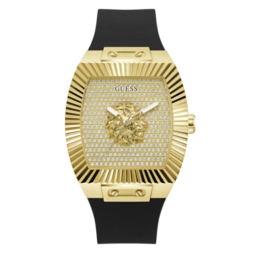 Reloj Guess Hombre GW1066G2 Phoenix Acero Dorado Analógico. Caja de acero reciclado dorado de 43mm de diámetro. Bisel dorado. Correa de silicona negra. Cierre hebilla. Esfera dorada. Cristal mineral. Movimiento quartz. Sumergible 50m. 3 años de garantía. Ref GW1066G2