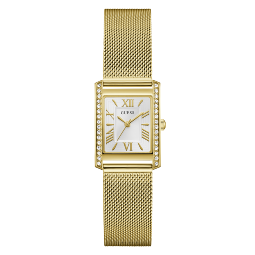 Reloj Guess Mujer GW0997L2 Bonnet Acero Dorado Analógico. Caja de acero reciclado dorado de 23mm de diámetro. Bisel dorado con cristales. Brazalete de malla de acero dorado. Cierre a presión. Esfera nácar. Cristal mineral. Movimiento quartz. Sumergible 30m. 3 años de garantía. Ref GW0997L2