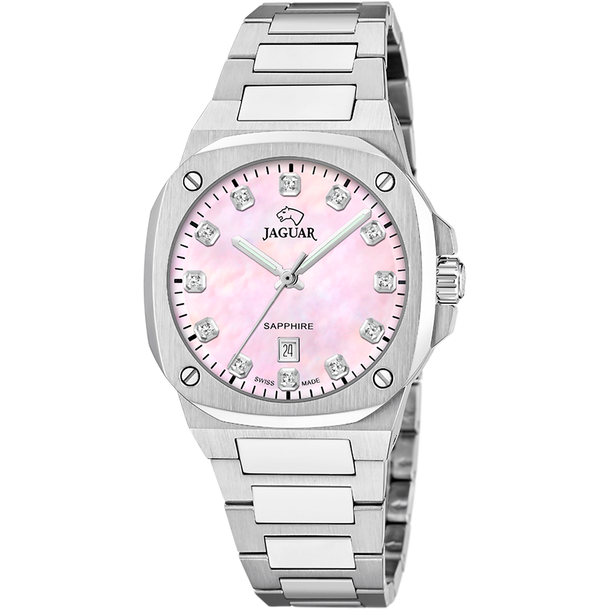 Reloj Jaguar Mujer J1027/6 Swiss Made Acero Analógico. Caja de acero de 34,3mm de diámetro. Bisel plateado. Brazalete de acero inoxidable. Cierre oculto. Esfera rosada. Multifunción, calendario. Cristal zafiro. Movimiento quartz suizo. Swiss Made. Sumergible 100m. 3 años de garantía. Ref J1027/6