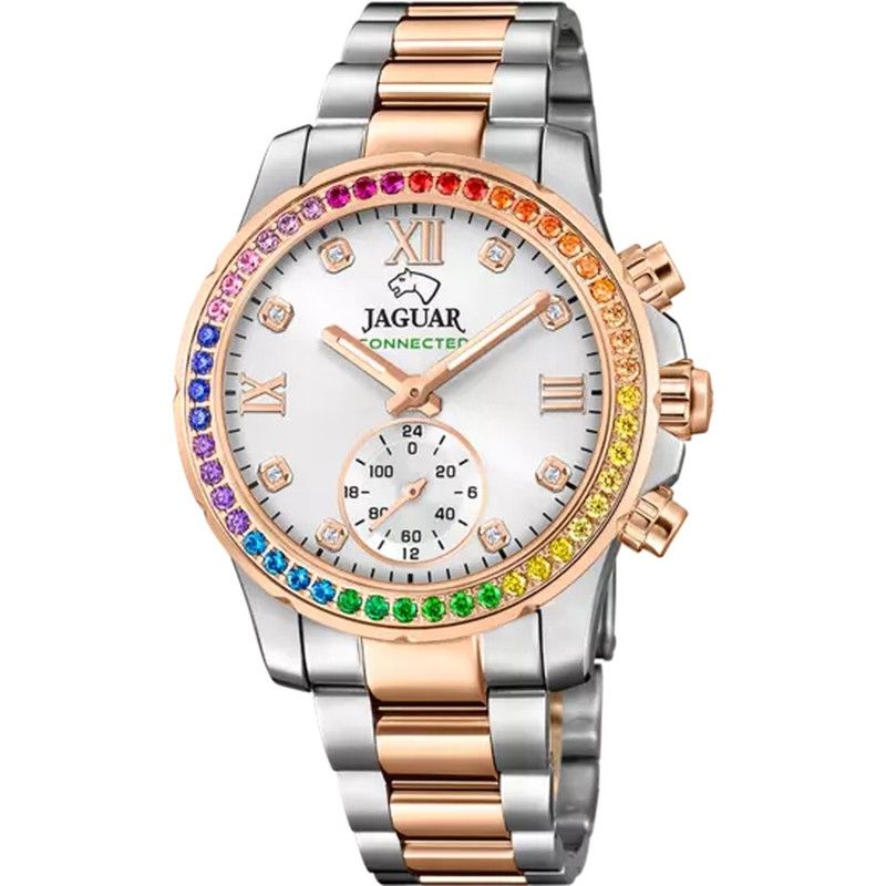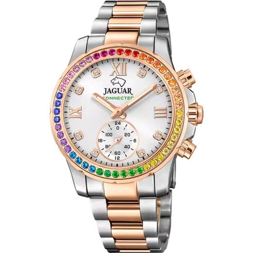 Reloj Jaguar Mujer J981/4 Connected Lady Acero Bicolor Rosa. Caja de acero inoxidable 316I bicolor rosado de 36,5mm de diametro y 13,15mm de grosor. Bisel de acero inoxidable 316I rosado con circonitas multicolor. Brazalete de acero inoxidable 316I bicolor rosado de 18,65mm de ancho. Cierre desplegable. Esfera blanca con circonitas. Multifunción, funciones inteligentes, cronómetro. Híbrido. Swiss made. Cristal zafiro. Movimiento quartz. Sumergible 50m. 3 años de garantía. Ref J981/4