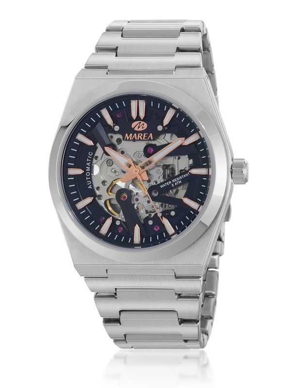 Reloj Marea Hombre B54274/2 Acero Automático. Caja de acero de 43mm. Bisel de acero. Brazalete de acero. Cierre desplegable. Esfera azul con mecanismo visible. Cristal mineral. Movimiento automático japonés. Sumergible 50m. 3 ańos de garantía. Ref B54274/2