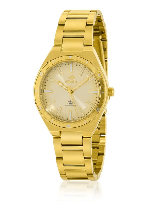 Reloj Marea Mujer B41383/5 Dorado. Caja de acero dorado de 34mm. Bisel de acero dorado. Brazalete de acero dorado. Cierre desplegable. Esfera dorada. Cristal mineral. Movimiento solar. Sumergible 50m. 3 años de garantía. Ref B41383/5