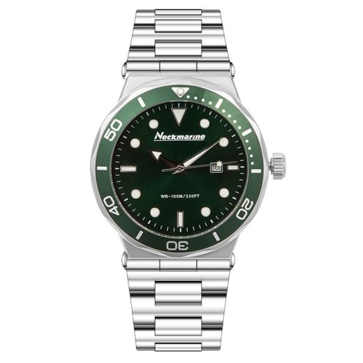 Reloj Neckmarine Hombre NKM4203M10M Acero Analógico. Caja de acero de 45mm de diámetro. Bisel giratorio verde. Brazalete de acero. Cierre desplegable. Esfera verde. Multifunción, calendario. Cristal mineral capa zafiro. Movimiento 2115. Sumergible 100m. Peso 175gr. 3 años de garantía. Ref NKM4203M10M