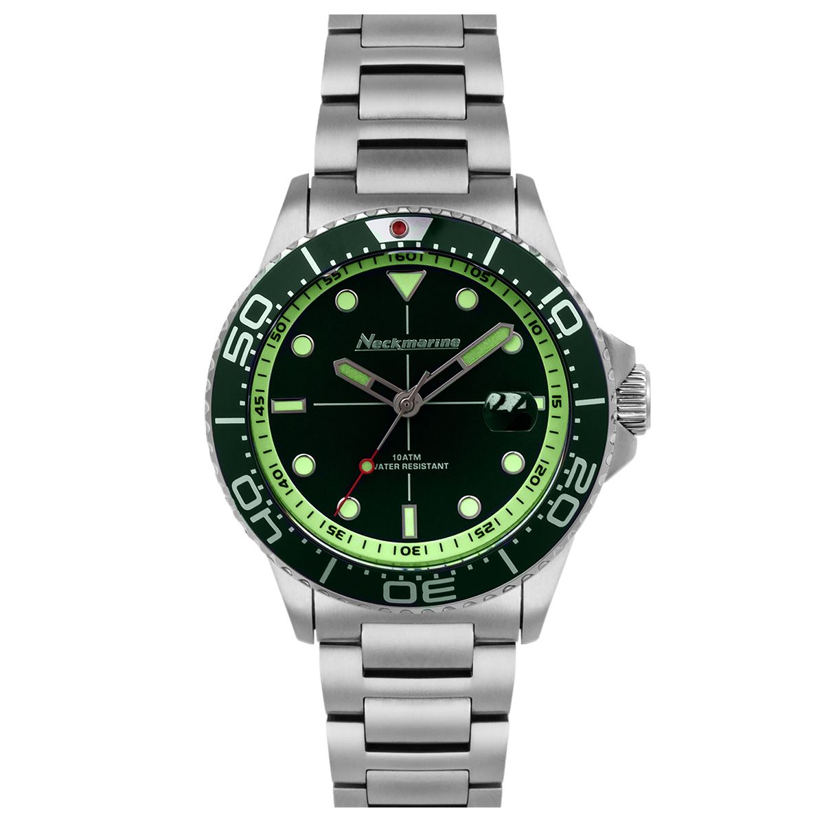Reloj Neckmarine Hombre NKM4514M10M Acero Analógico. Caja de acero de 42mm de diámetro. Bisel verde. Brazalete de acero. Cierre desplegable. Esfera verde. Multifunción, calendario. Cristal mineral capa zafiro. Movimiento Miyota 2315. Sumergible 100m. Peso 150g. 3 años de garantía. Ref NKM4514M10M