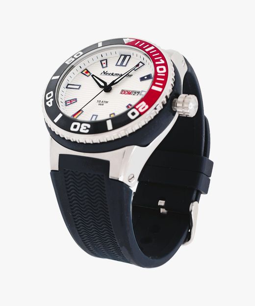 Reloj Neckmarine Hombre NM0989J05 Azul Acero Analógico. Caja de acero de 42mm de diámetro. Bisel azul bicolor rojo. Correa de silicona azul. Cierre hebilla. Esfera blanca. Multifunción, calendario. Cristal mineral. Movimiento Miyota 2305. Sumergible 100m. Peso 130g. 3 años de garantía. Ref NM0989J05