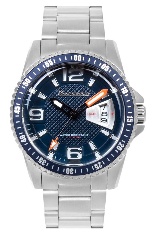 Reloj Neckmarine Infantil NKM3385L05M Acero Analógico. Caja de acero de 38mm de diámetro. Bisel giratorio plateado. Brazalete de acero. Cierre desplegable. Esfera azul. Multifunción, calendario. Cristal mineral. Movimiento Miyota 2317. Sumergible 100m. Peso 135g. 3 ańos de garantía. Ref NKM3385L05M