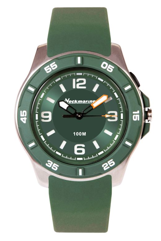 Reloj Neckmarine Unisex NM-X1688M10 Verde Acero Analógico. Caja de acero y resina plateada de 42mm de diámetro. Bisel verde. Correa de caucho verde. Cierre hebilla. Esfera verde. Cristal mineral. Movimiento Y21. Sumergible 100m. Peso 45g. 3 años de garantía. Ref NM-X1688M10