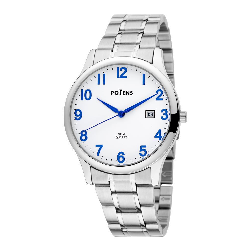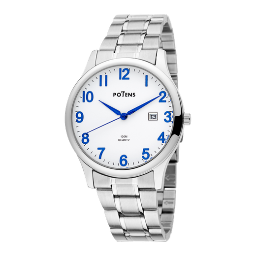 Reloj Potens Hombre 40-3016-0-2 Acero Analógico. Caja de acero inoxidable de 39 mm de diámetro. Bisel plateado. Brazalete de acero inoxidable. Cierre desplegable de acero inoxidable. Esfera blanca bicolor azul. Calendario, hora, minutos, segundos. Cristal mineral. Movimiento cuarzo. Sumergible 100m. 3 años de garantía. Ref 40-3016-0-2