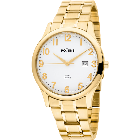 Reloj Potens Hombre 40-3020-0-0 Acero Dorado Analógico. Caja de acero inoxidable dorado de 39 mm de diámetro. Bisel dorado. Brazalete de acero inoxidable dorado. Cierre desplegable de acero inoxidable. Esfera blanca bicolor dorado. Calendario, hora, minutos, segundos. Cristal mineral. Movimiento cuarzo. Sumergible 100m. 3 años de garantía. Ref 40-3020-0-0