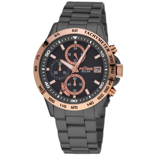 Reloj Potens Hombre 40-3040-0-1 Acero Negro Bicolor Rose Cronógrafo Analógico. Caja de acero inoxidable negra de 44 mm de diámetro. Bisel rose. Brazalete de acero inoxidable bicolor negro. Cierre desplegable de acero inoxidable. Esfera negra bicolor rose. Calendario, hora, minutos, segundos, cronógrafo, 0-24h. Cristal mineral. Movimiento solar. Sumergible 100m. 3 años de garantía. Ref 40-3040-0-1