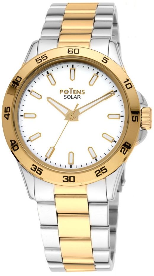 Reloj Potens Hombre 40-3042-0-1 Acero Bicolor Dorado Analógico. Caja de acero inoxidable de 42 mm de diámetro. Bisel dorado. Brazalete de acero inoxidable bicolor dorado. Cierre desplegable de acero inoxidable. Esfera blanca. Hora, minutos, segundos. Cristal mineral. Movimiento solar. Sumergible 100m. 3 años de garantía. Ref 40-3042-0-1