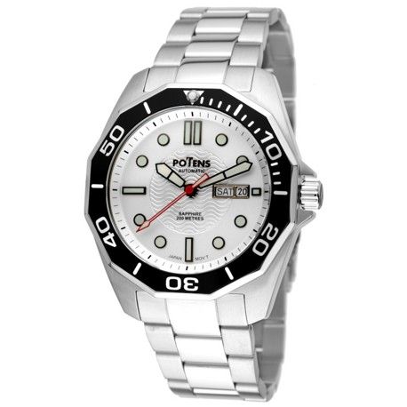 Reloj Potens Hombre 40-3049-0-2 Acero Automático. Caja de acero de 44mm de diámetro. Bisel negro. Brazalete de acero inoxidable. Cierre desplegable. Esfera blanca. Multifunción, calendario. Cristal zafiro. Movimiento automático. Sumergible 200m. 3 años de garantía. Ref 40-3049-0-2