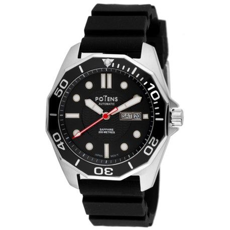 Reloj Potens Hombre 40-3050-0-1 Sport Negro Acero Automático. Caja de acero de 44mm de diámetro. Bisel negro. Correa de silicón negro. Cierre hebilla. Esfera negra. Multifunción, calendario. Cristal zafiro. Movimiento automático. Sumergible 200m. 3 años de garantía. Ref 40-3050-0-1